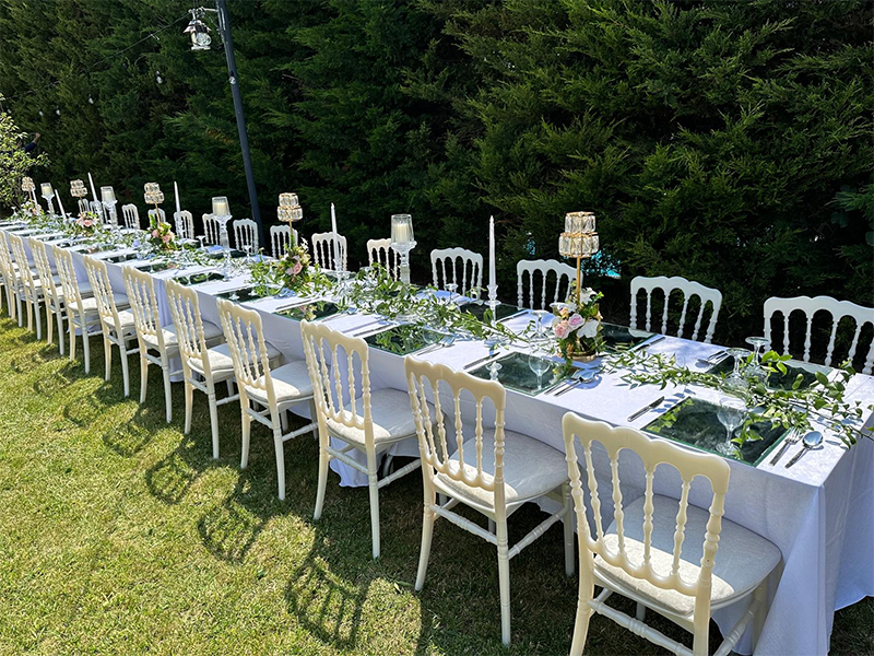 BAHÇEDE NİŞAN SANDALYE ‘ son zamanların trendi haline gelen Bahçe Nişan Organizasyon’ları için Kiralık Sandalye hizmeti en fazla talep alanlar arasında yer almaktadır. Desk Event Turizm olarak bünyemizde 3000 adet Sandalye bulunmaktadır bizlerden alacagınız hizmet ile organizasyon’larınıza farklı bir ambiyans katmaya ne dersiniz? Napolyon Sandalye Kiralama bu tarz organizasyon’larda çok revaştadır özellikle Beyaz Napolyon Sandalye ve Gümüş Napolyon Sandalye en fazla tercih edilenler arasında gelmektedir.